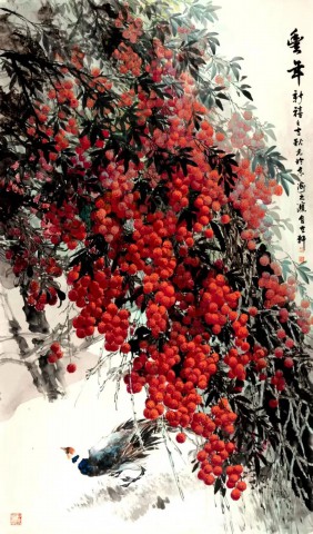 陈秋光先生笔下荔枝笔笔生辉,色彩明快清雅与炽烈双重性,淡雅为骨以水墨为基调,辅以花青、赭石等淡彩,保留文人画的清逸气质。其次点睛之艳偶用朱砂、石青等饱和色点染花蕊或鸟冠,如静谧中的一声清响,瞬间激活全幅。