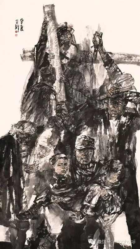 愚以题材观画多出识读之便,而邹君多年心血着力之处是在绘画本体中造型与笔墨、传统与现代等百年难题。他说,“造型并非是状物,而是写心的理念,笔墨是精神,并非是物质,然而它们永远是驱动水墨人物画艺术前进的双轮。”那么该如何将西方素描造型的写实理念有机融入中国传统写意人物的笔墨表现?探索数载后,他选择加强传统的笔墨节奏与黑白虚实,使得水墨丰沛韵味十足;同时吸纳西方科学的人物结构研究,强化画面经营的形式构成,使得构图充实饱满,笔力气息雄壮厚重。可以说,在中西法度问题上,邹立颖突破了传统人物画的线条造型和文人画的简逸取向,为人物画的造型语言和审美趣味做出了创见性的积极探索,也为当代中国绘画注入了鲜活的生命力,而所有这些又都是建立在中国画笔墨特点和写意精神的本质特征基础上。变不离宗,尤难尤难!