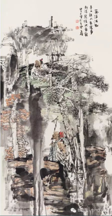三、传统人物创作系列。邹立颖的传统人物作品多作松下高士,晋唐屏风壁画也偶有“树下人物”图式,艺思巧借或灵犀暗合都是画史寻常,然邹君画中之树皆作高松却可见其矢志言喻的人文精神。常青松柏自唐代张璪、毕宏以来就成为画家笔下宠儿,传为唐末荆浩所作的《笔法记》中以“君子德风”阐释松之品格:“夫木之生,为受其性。松之生也,枉而不曲遇,如密如疎,匪青匪翠,从微自直,萌心不低。势既独高,枝低复偃,倒挂未坠于地下,分层似迭于林间,如君子之德风也。”文尾又作《古松赞》:“不凋不容,惟彼贞松。势高而险,屈节以恭。叶张翠盖,枝盘赤龙。下有蔓草,幽阴蒙茸。如何得生,势近云峰。仰其擢干,偃举千重。巍巍溪中,翠晕烟笼。奇枝倒挂,徘徊变通。下接凡木,和而不同,以贵诗赋,君子之风。风清匪歇,幽音凝空。”松与梅兰竹菊同为画中君子乐见于文人雅士,如各按性论,松独属傲岸,命力顽强,山境愈深姿态愈奇,故有高士常伴,隐者相随。君子之性,寿者之相也。邹君画中反复重构高松雅士,画旨可是如此?